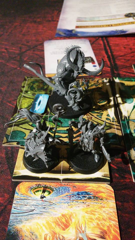 Il faut à ces dés ajouter les dés du destin, ue mécanique à double tranchant. Le premier joueur du tour lance 1 fois les 5 dés du destin. On ne conserve que les dés de valeurs unique, et on défausse les valeurs en double ou triple. Premier effet, les dés défaussés vont déclencher des effets en fonction des valeurs de dés, de l'apparition de familiers du Gaunt Summoner, à des Evènements inattendus.
