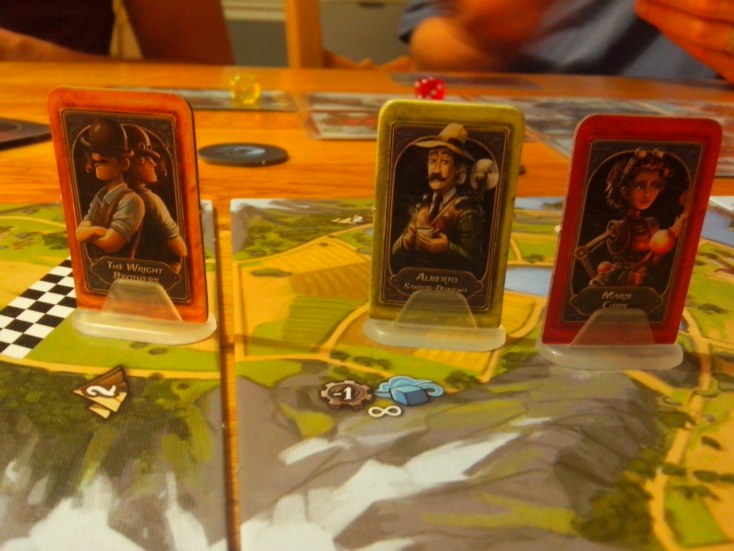 Les 3 pilotes sont placés au pied de la montagne. Ils vont s'affronter dans une course dantesque et somme toute rapide. Nous avons là Alberto Santos-Dumont (Valérie), les Frères Wright (Tom) et Marie Curie toute de rouge vêtue avec son bras bionique.