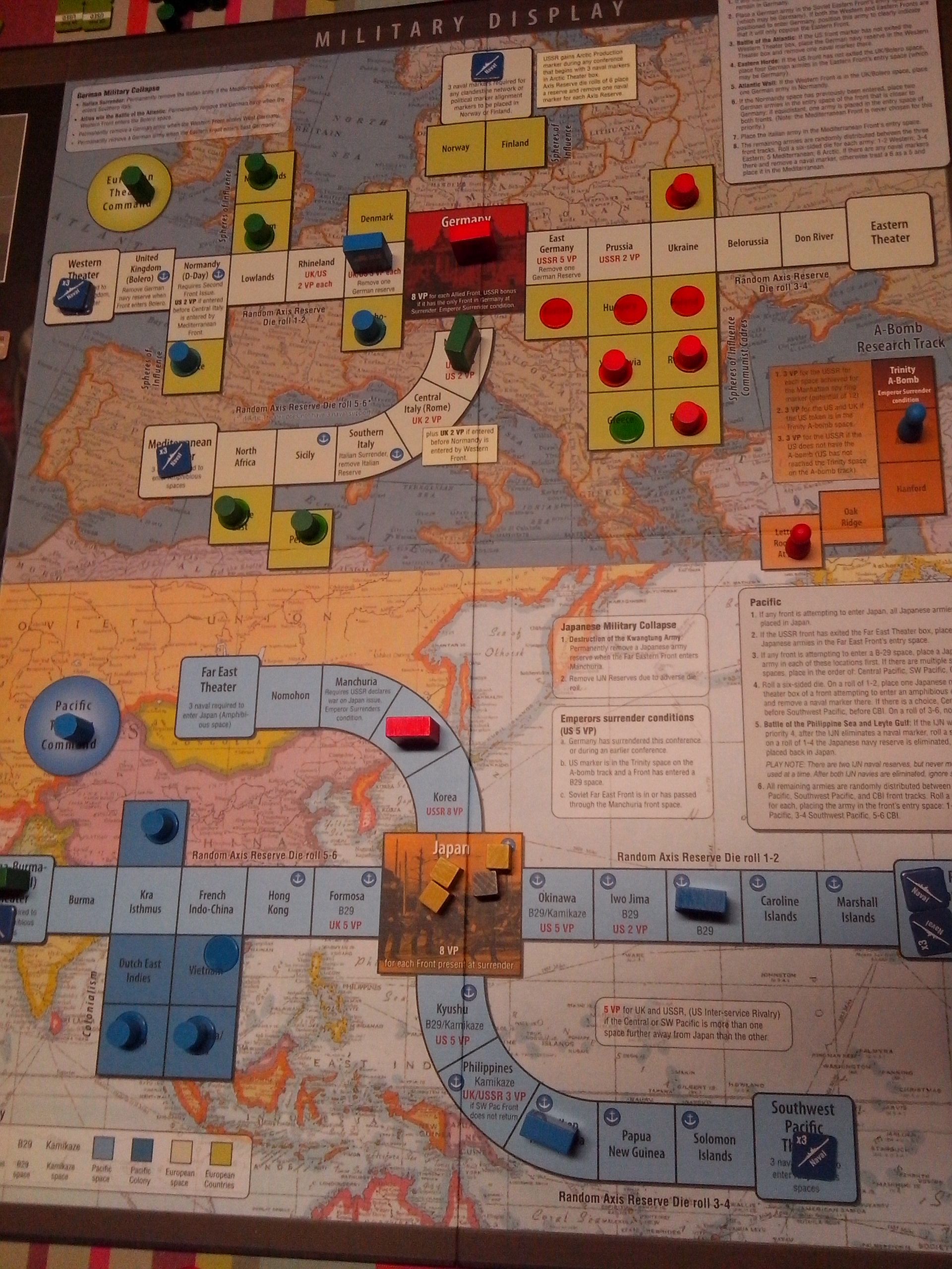 La conférence de Moscou propose une petite surprise lorsque les américains mettent aux voies, la déclaration de guerre soviétique au Japon. Celle-ci n'est pas disputée et finit au centre des débats, donc la déclaration est effective. Ne reste plus qu'à financer cet effort de guerre...et là, on sent bien que le camarade Staline n'est pas des plus concerné. En tous cas l'effort demandé (qui conduit tout de même à l'envahissement de la Mandchourie), plus un peu de production allouée au développement technologique de la bombe atomique (pour rien car les recherches produites étaient très bonnes à cette période là de l'année), vont en partie coûter les percées sur Berlin, mais la pression sur l'Allemagne se faire sentir de part et d'autre de manière équitable.